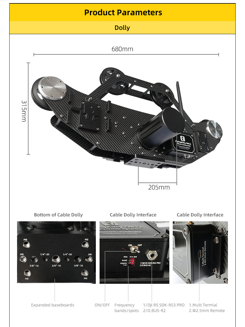 Depends on the Modular design, FM2 III electronic control system can be detached from the cablecam dolly to be used as a remote control camera system, mounted on the rocker, slide, car mount, tripod, control DJI Ronin stabilizer and video camera or camera.