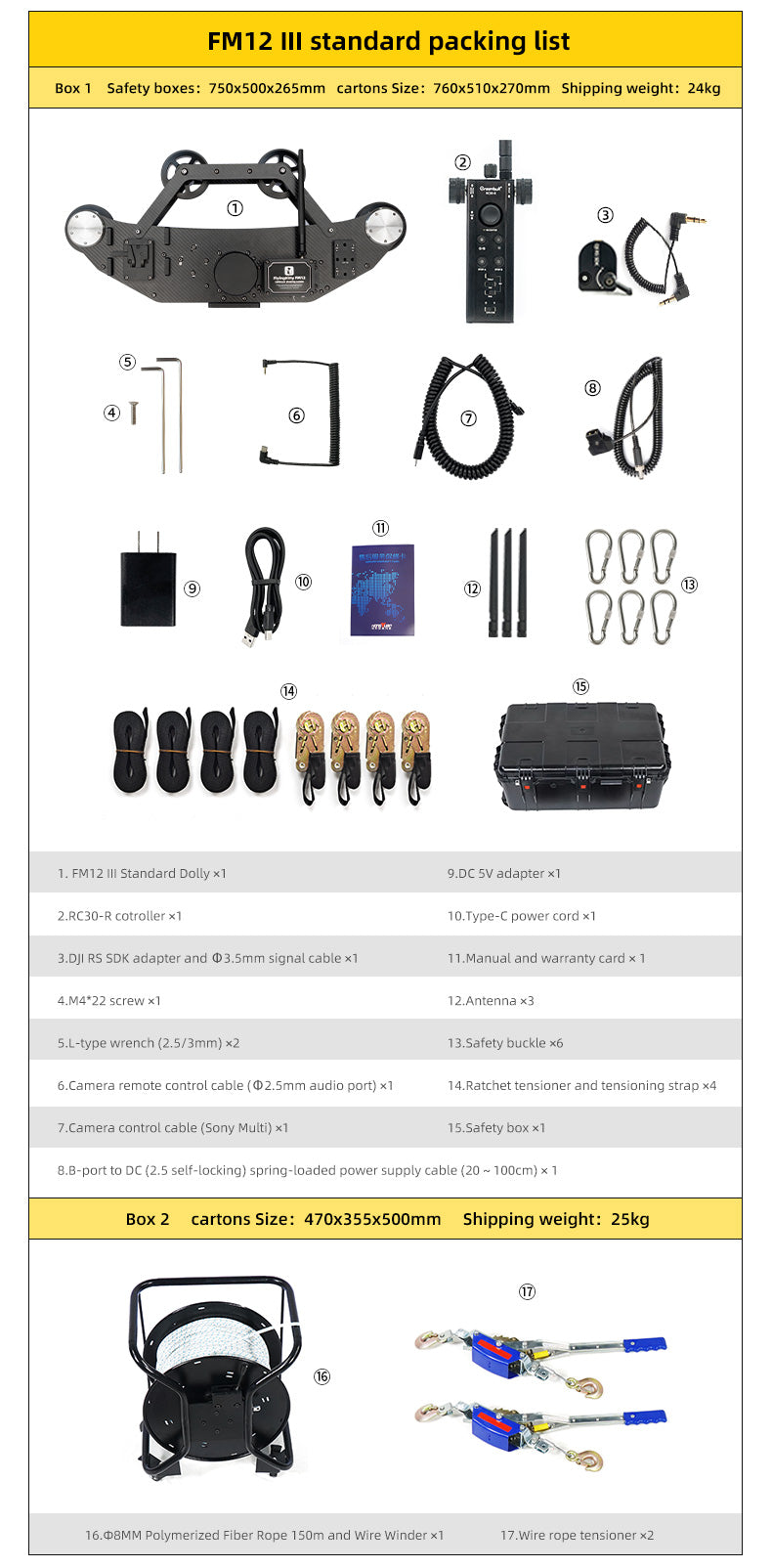 FM12 III is a medium-sized cablecam device developed for DJI R2 and RS3 PRO, which payload is 12kg, integrated with DJI RS SDK protocol, and has controls for stabilizers, cameras, camcorders, aswell as focus-following, FM12 III is easy and quick to learn and operate with a range of strong functions. It is increasingly widely used in live events, performances and shows, sports competitions, concerts, music festivals, weddings and receptions, and of course, film and television dramas, documentaries and outdoor reality shows to present an overhead view of the scene.