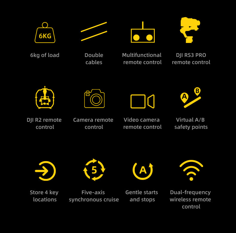 3-axis attitude control/direction switching/speed adjustment Joystick neutral Lock/Wake-up Switch according to the mode Multi-axis synchronization with the cable dolly |